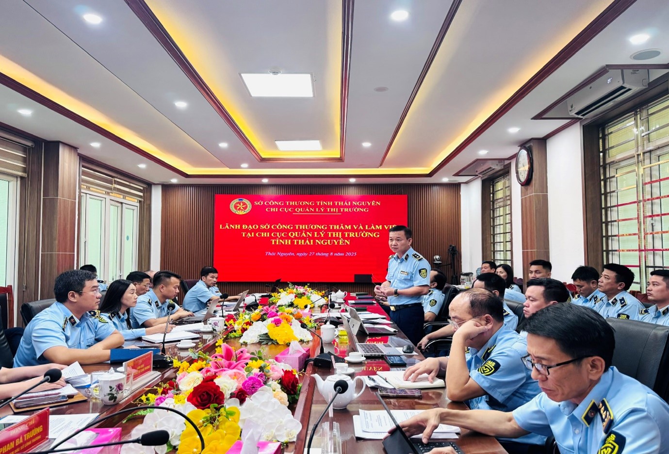 Ngày 27/8/2025, tại trụ sở Chi cục Quản lý thị trường tỉnh Thái Nguyên, Đoàn công tác của Sở Công Thương tỉnh Thái Nguyên do đồng chí Phạm Văn Thọ - Ủy viên Ban Thường vụ Tỉnh ủy, Giám đốc Sở làm Trưởng đoàn, cùng tham dự Hội nghị có Phó Giám đốc Sở phụ trách Chi cục QLTT, Chánh Văn phòng Sở. Về phía Chi cục Quản lý thị trường có Ban Lãnh đạo Chi cục QLTT và Trưởng, phó các phòng chuyên môn, các đội Quản lý thị trường trực thuộc Chi cục QLTT.