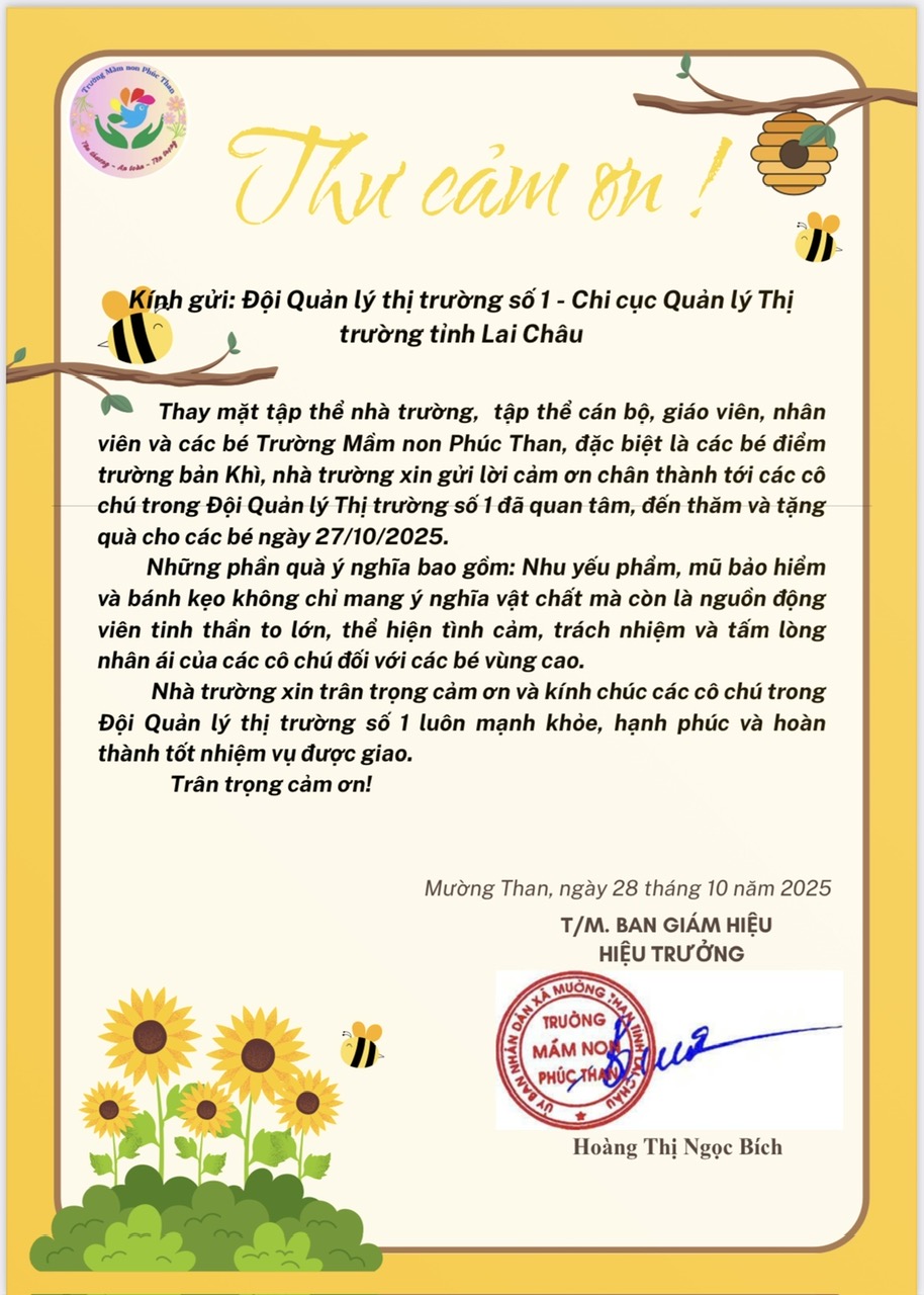 Thay mặt ban giám hiệu nhà trường ngày 28 tháng 10 năm 2025 Hiệu trưởng cô giáo Hoàng Thị Ngọc Bích đã gửi thư cảm ơn đến Đội Quản lý thị trường số 1 tỉnh Lai Châu.